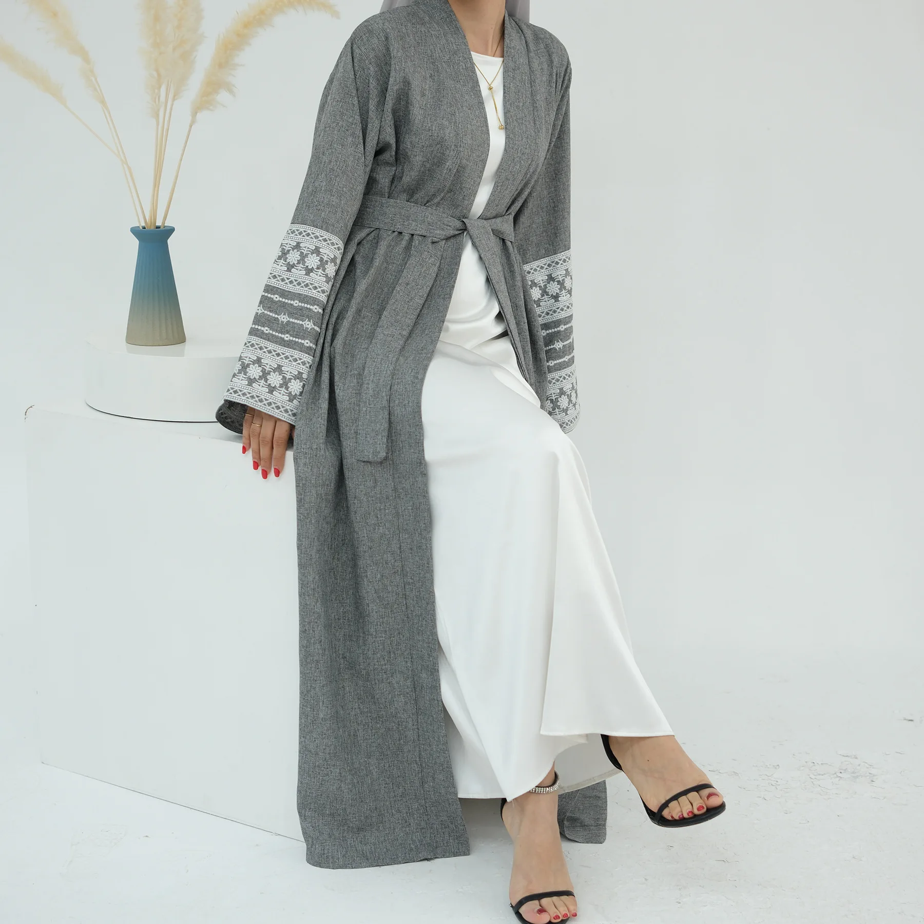 PROMISTAR Oversized Embroidered Abaya Belt Ladies Full-Length Kimono Female Embroidery Sleeves Linen Open Fashion Abaya