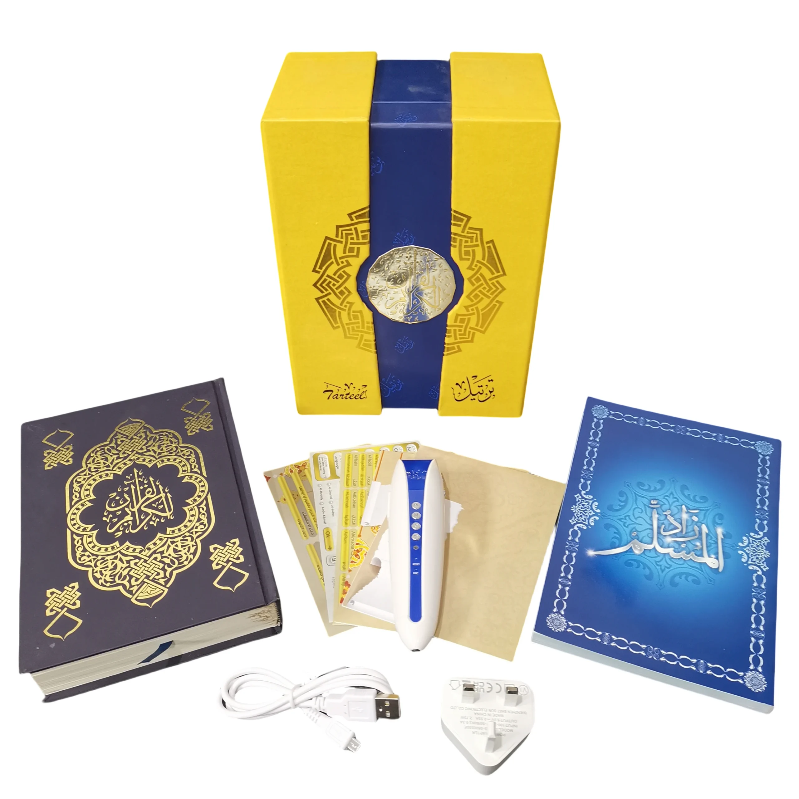 1xZad Muslim book;1xQuran read pen;1xUK-pin charger;1xUSB cable;1XEarphone;1xleather bag;3 pcs of function cards and 1 book mark;1x cloth bag;1x Luxury color box.;
