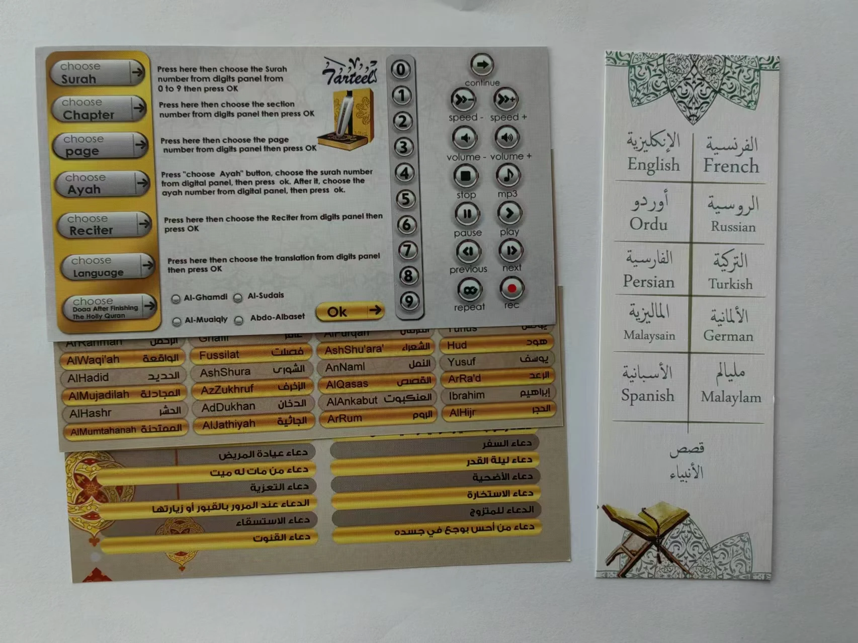 3. 13 languages voice available including Al-Jalalein, Chinese, English, French, Germany, Russian, Spanish, Turkish, Urdu, Malaysia, Farsi, Malayalam;